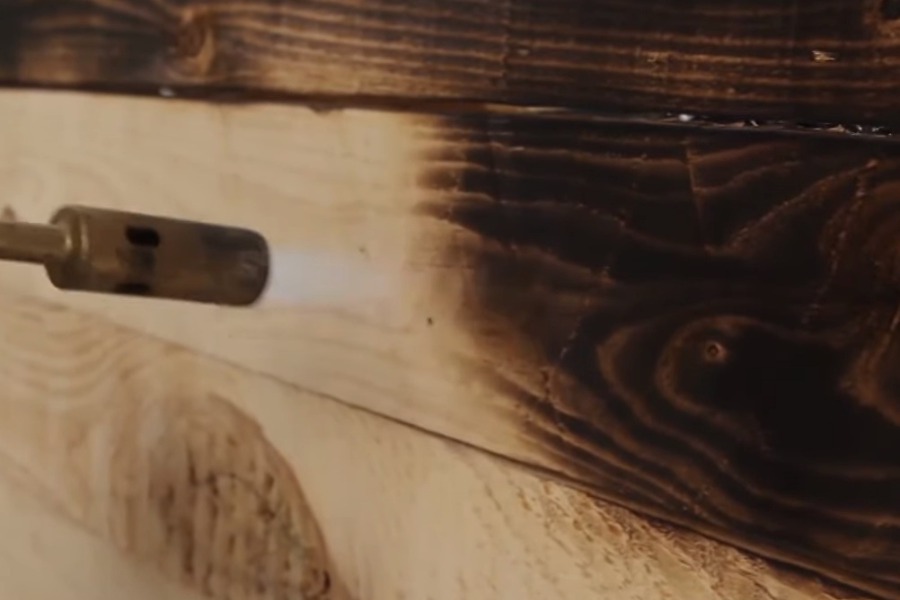 - Se debe quemar la capa exterior de la madera, para lo cual podemos utilizar un soplete que iremos regulando de tal manera que el carbonizado de la superficie quede uniforme, evitando que esta quede encendida o que se carbonice a tal grado de que se pierda la veta natural. Una velocidad de aproximadamente 5cm de recorrido por segundo suele bastar.
